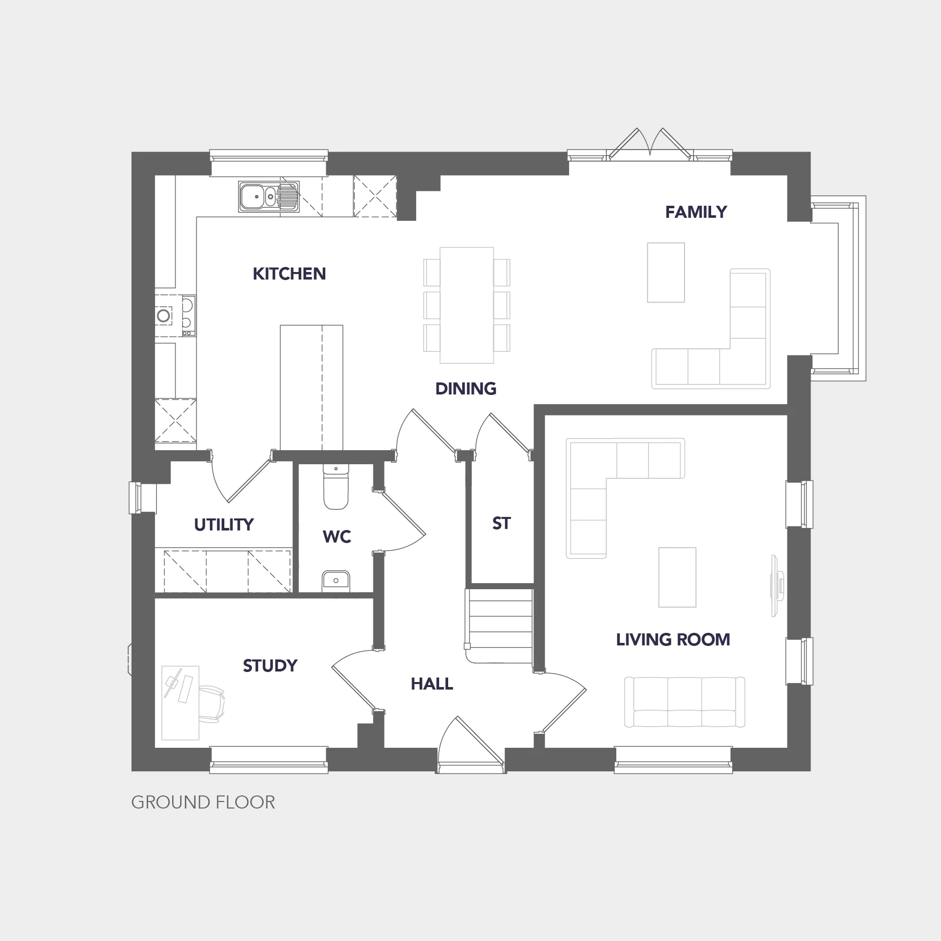 The ground floor features a welcoming hallway leading to a living room and a large open-plan kitchen, dining, and family area, which is the perfect social hub of the home, complete with French doors opening onto the garden. A study, utility room, and WC add to the practical layout.