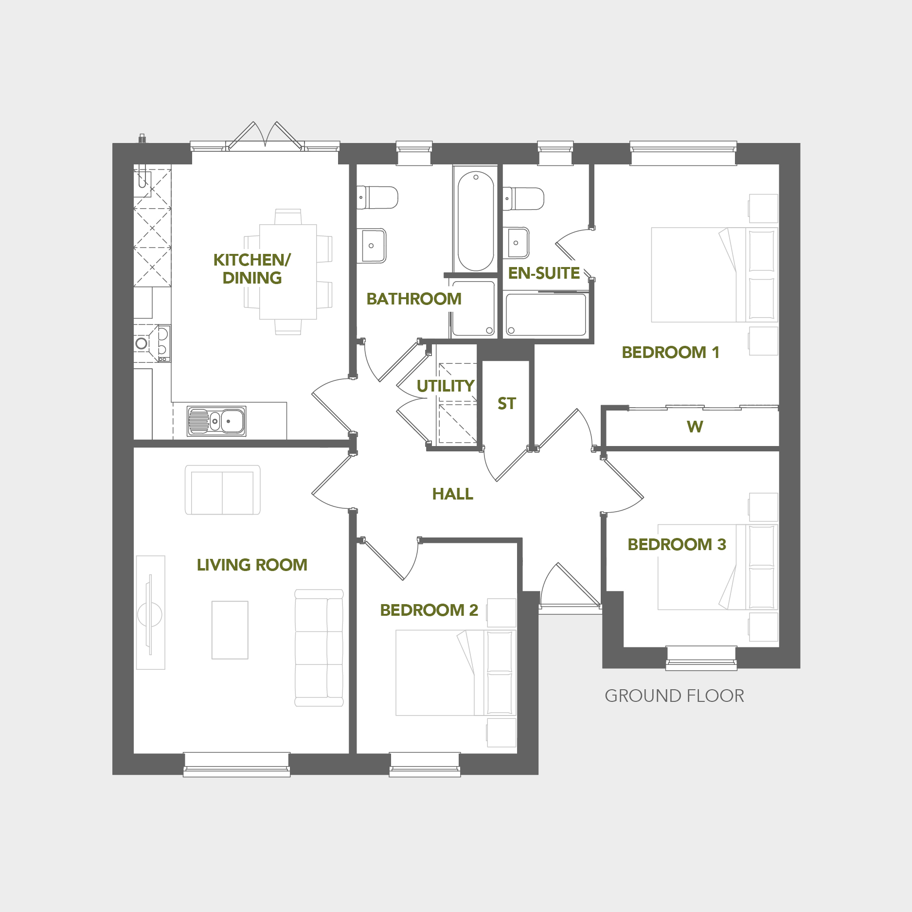 The principal bedroom includes an en-suite shower room, while two additional bedrooms are served by a family bathroom. A useful utility space provides room for laundry appliances and everyday storage, helping to keep the main living areas clear and organised.