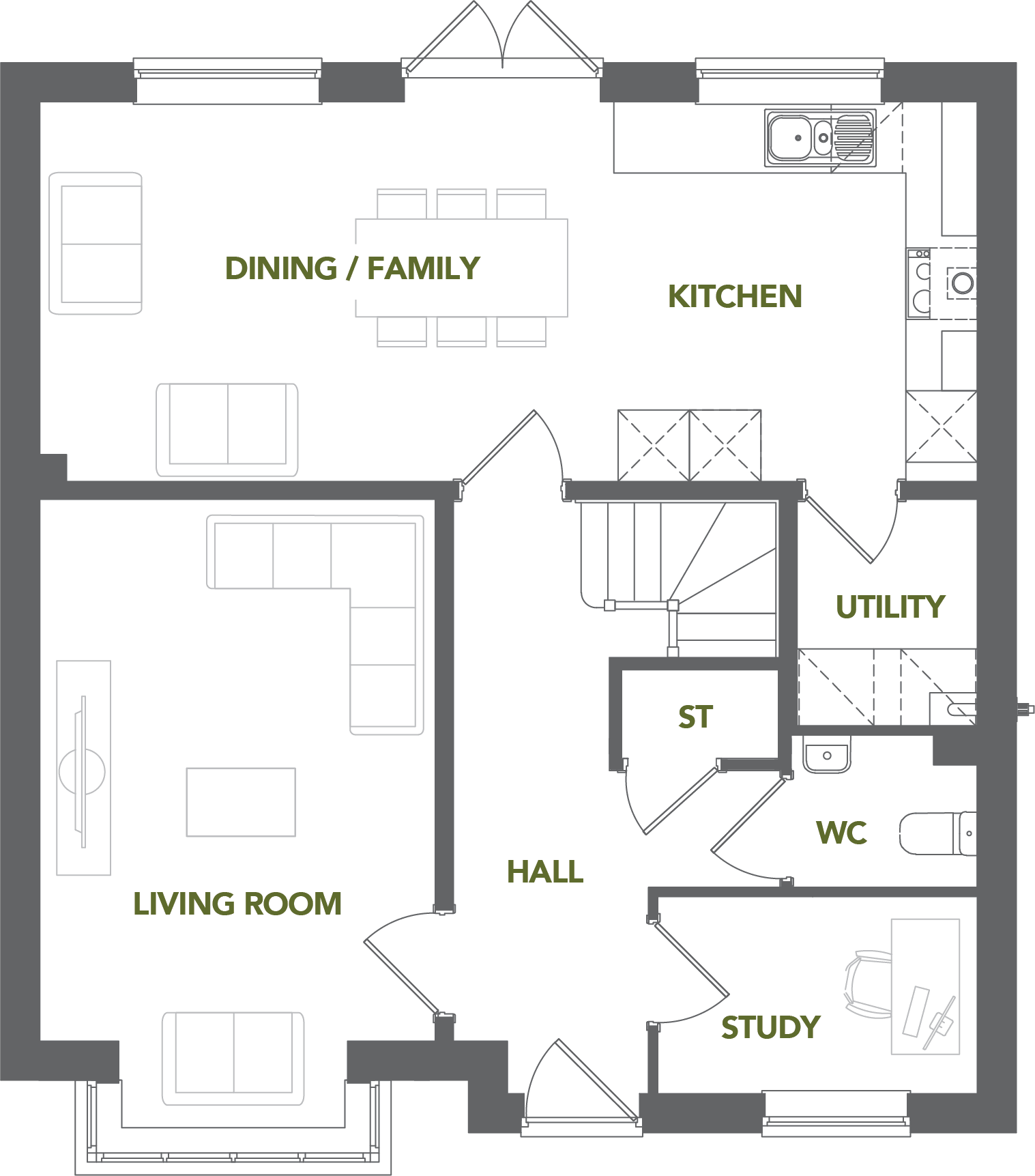 The ground floor features a generous living room and a separate study, perfect for home working. To the rear, an open-plan kitchen, dining and family area spans the width of the home, with French doors leading to the garden. A utility room and cloakroom complete the ground floor.