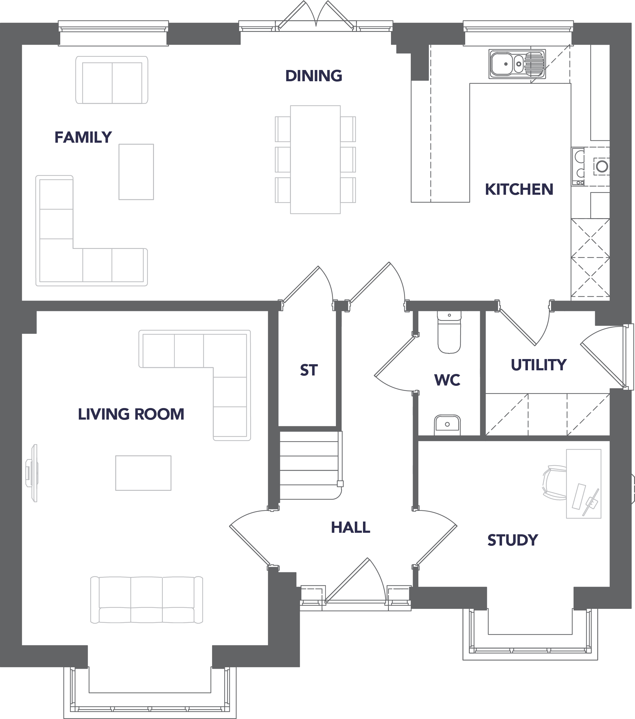The ground floor offers a refined layout, featuring a large living room to the front and a striking open-plan kitchen, dining, and family area to the rear — a true centre piece for entertaining and everyday living. French doors open onto the garden, while a dedicated study, utility room, and cloakroom add both style and practicality.