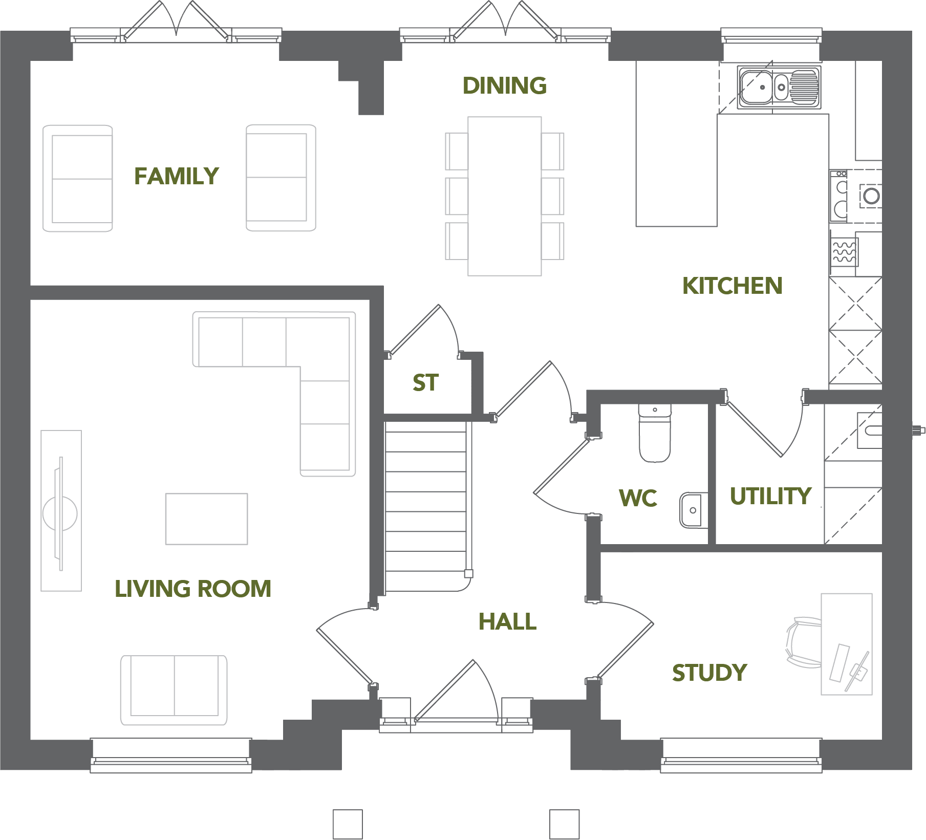The ground floor is designed to support modern family life with a generous layout that flows naturally from room to room. The dual aspect living room provides a bright and welcoming space, complemented by a separate family room that offers additional flexibility for day-to-day living. At the heart of the home is the open plan kitchen and dining area, featuring a well-arranged kitchen layout and direct access to the rear garden. A study, utility room and a convenient WC complete the ground floor.