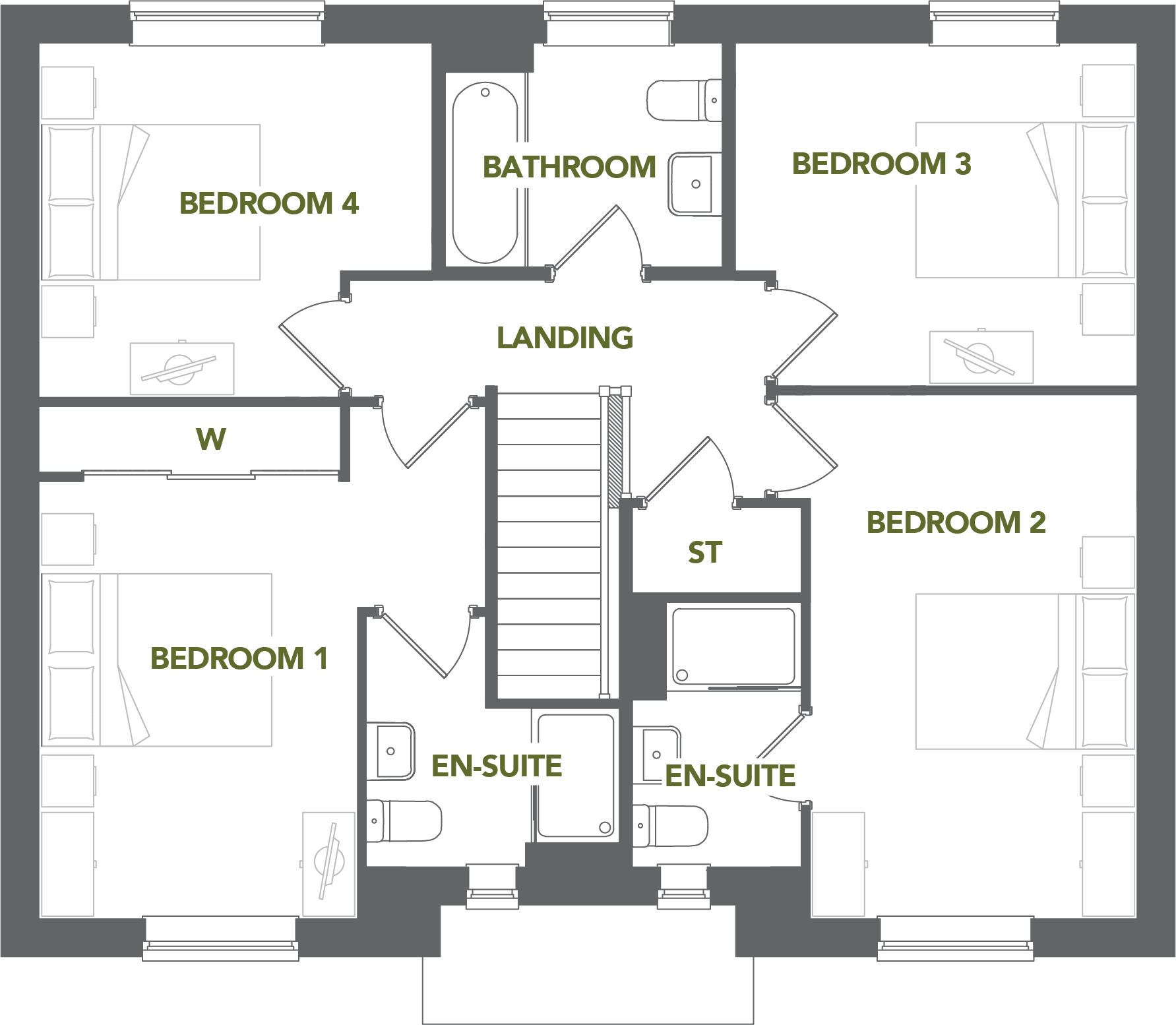 Upstairs, the layout provides four comfortable bedrooms arranged around a central landing. The principal bedroom includes an en suite, while the second bedroom benefits from its own en suite, creating an ideal guest room. Bedrooms three and four are well sized and are served by the family bathroom. Storage is thoughtfully integrated throughout the home to ensure a practical and organised layout.