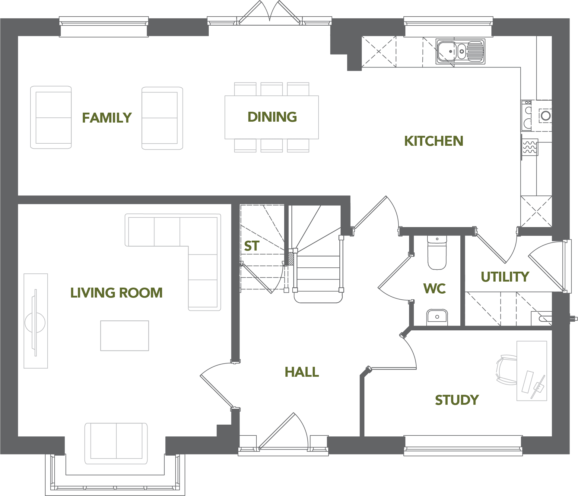 The ground floor features a large living room to the front and a separate study, ideal for home working. To the rear, an open-plan kitchen, dining and family area extends across the width of the home, with French doors opening to the garden. A utility room, cloakroom and storage cupboard complete the ground floor.