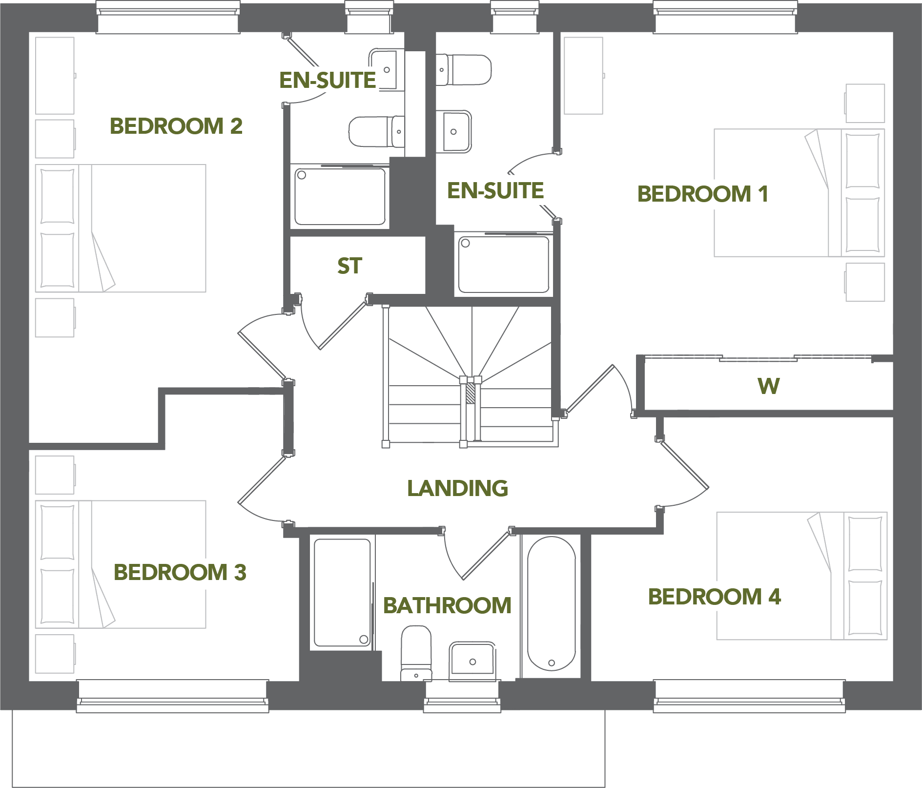Upstairs, both the principal bedroom and bedroom two benefit from en-suite shower rooms, while two further bedrooms share a spacious family bathroom. A central landing connects each room and provides additional storage space.