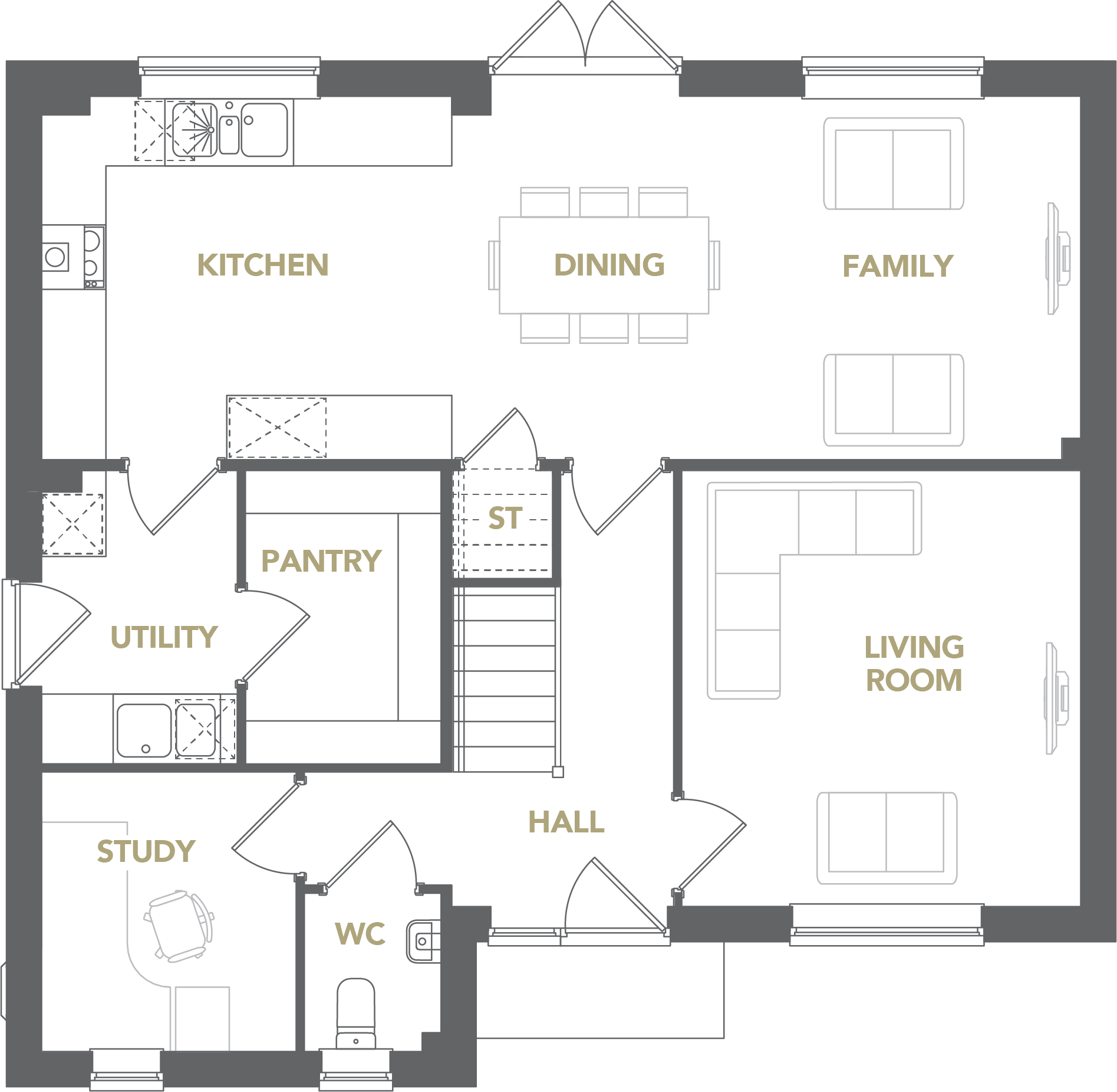 Stretching across the back of the house, the expansive kitchen/dining/family room is the true heart of the home, complemented by a separate utility room, walk-in pantry, and a flexible study or playroom on the ground floor. Upstairs, four large bedrooms await, including two with en-suites, while the luxurious main bedroom also boasts a walk-in wardrobe.
