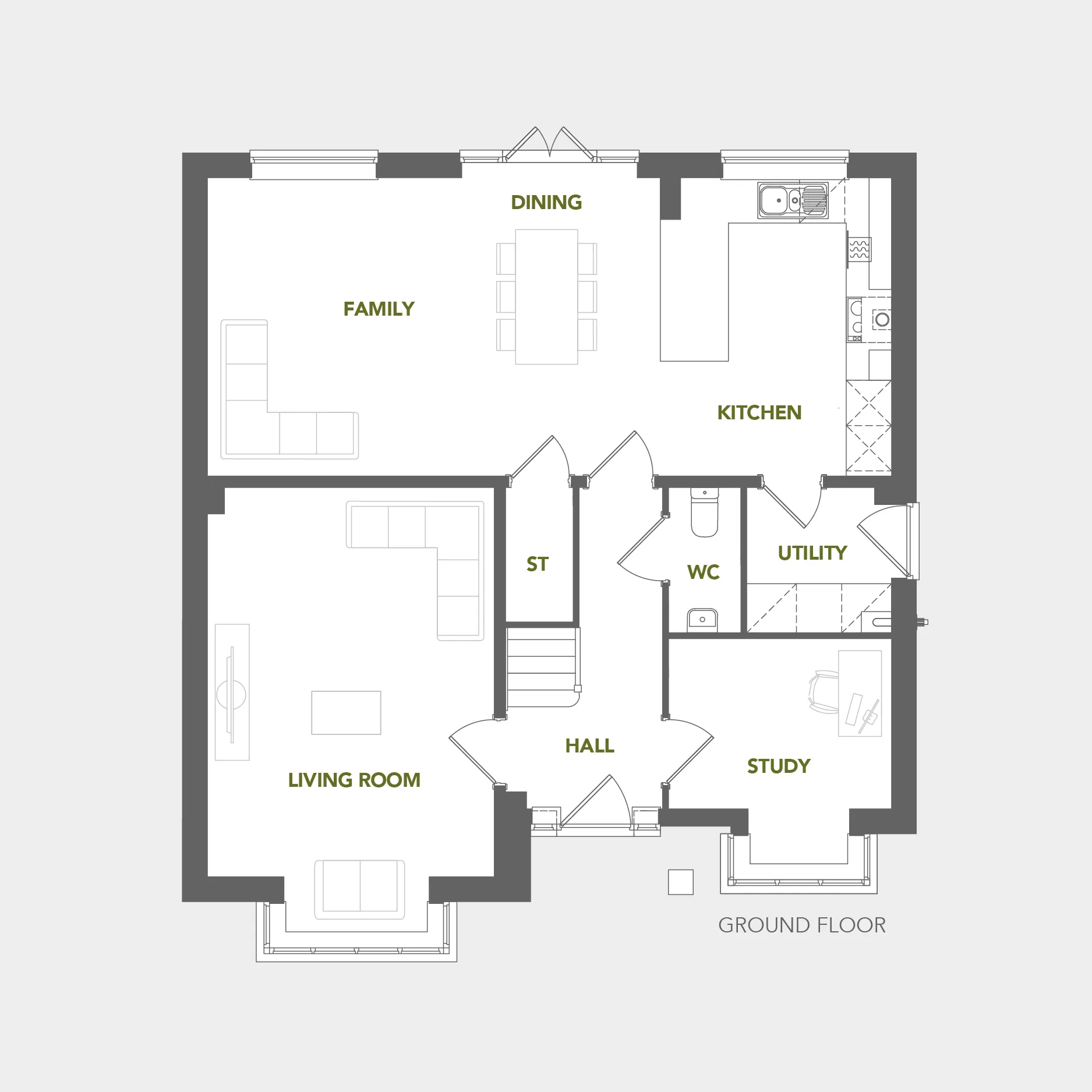 The ground floor features a spacious living room to the front and a separate study, ideal for home working. To the rear, an open-plan kitchen, dining and family area creates a sociable heart to the home, with French doors opening onto the garden. A utility room, cloakroom and storage cupboard complete the ground floor layout.